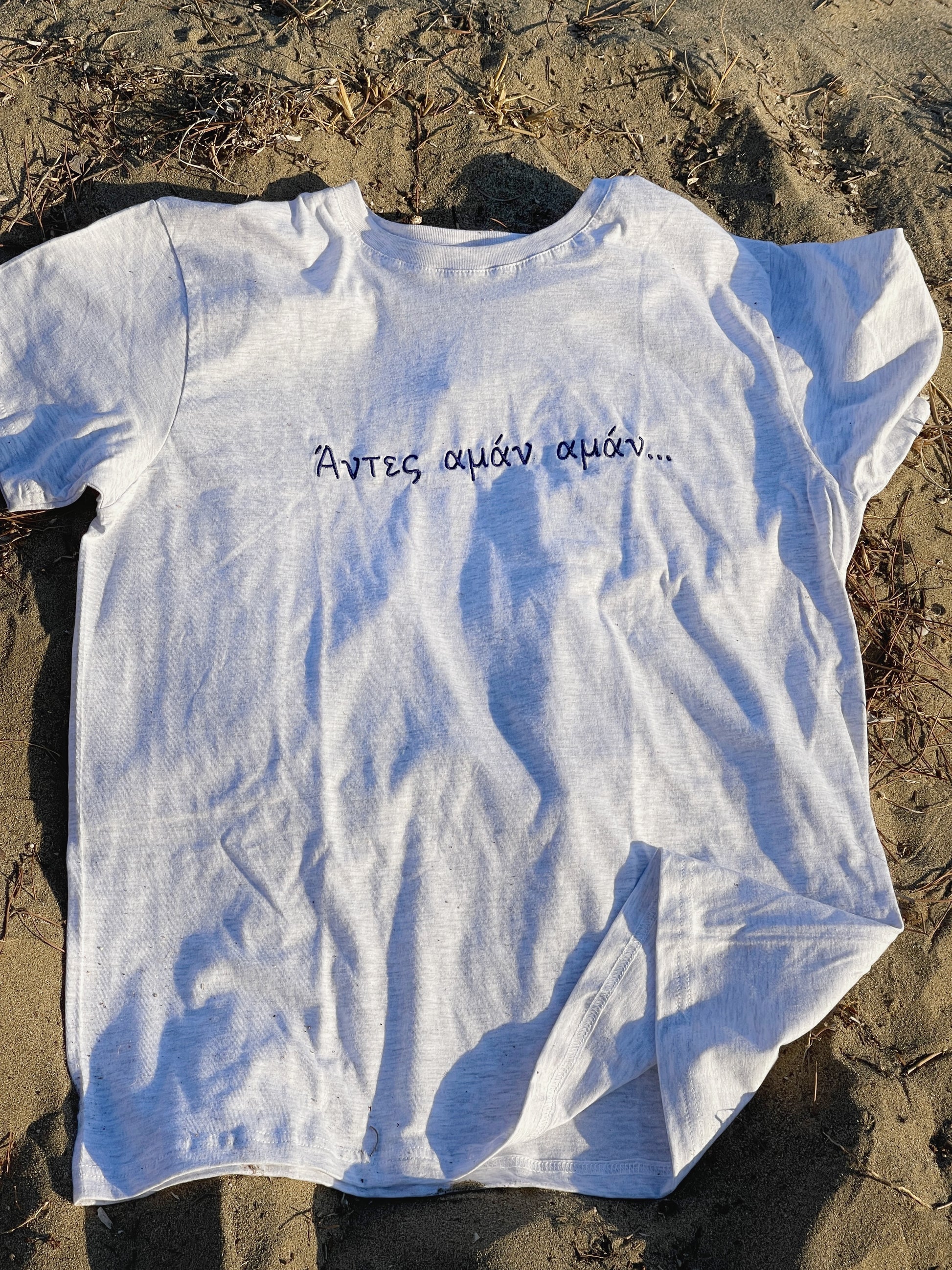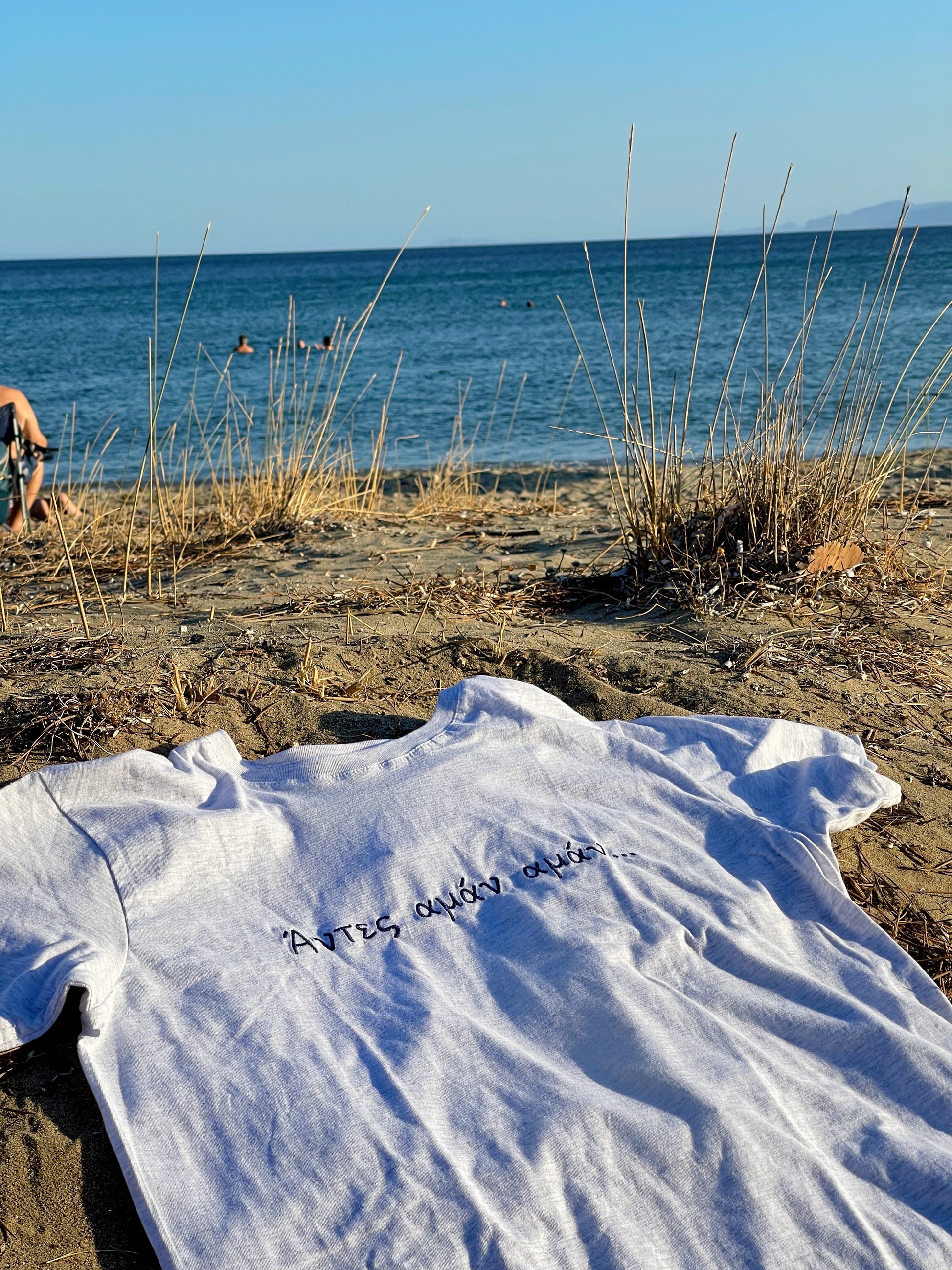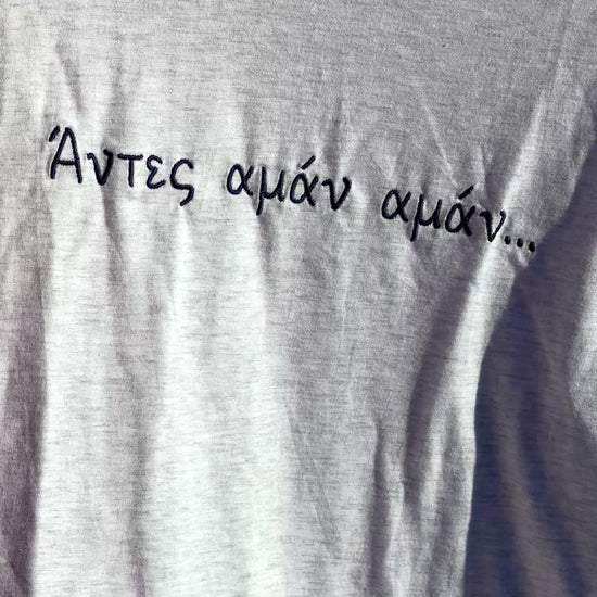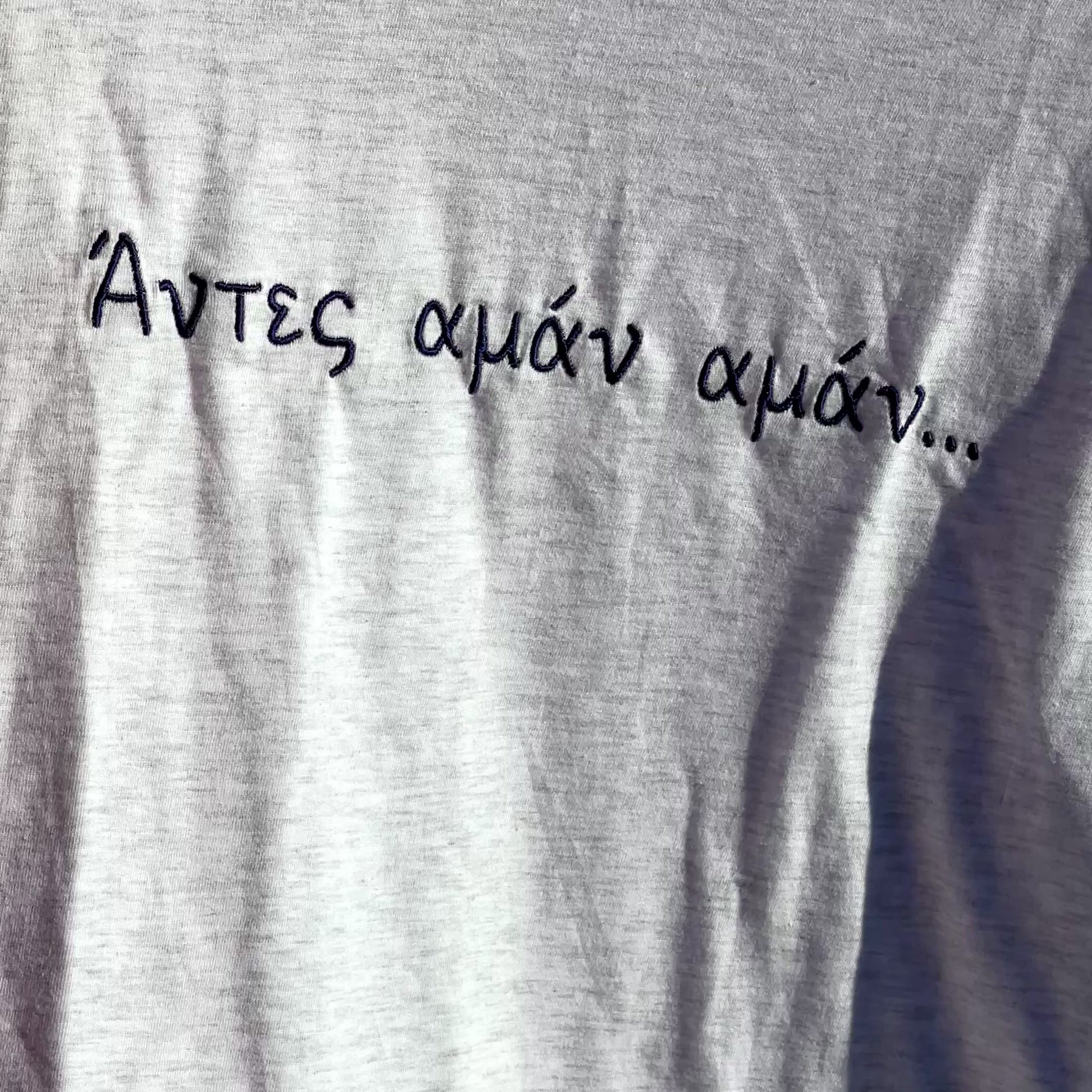 Το unisex κεντημένο t-shirt “Άντες Αμάν Αμάν” φέρνει μαζί του το ρυθμό των ελληνικών νησιών και την ανεμελιά του καλοκαιριού. Σε ανοιχτό γκρι χρώμα και φτιαγμένο από δροσερό, ποιοτικό βαμβάκι, ξεχωρίζει για το κέντημα της χαρακτηριστικής φράσης που θυμίζει νυχτερινά γλέντια, παρέες και καλοκαίρια.