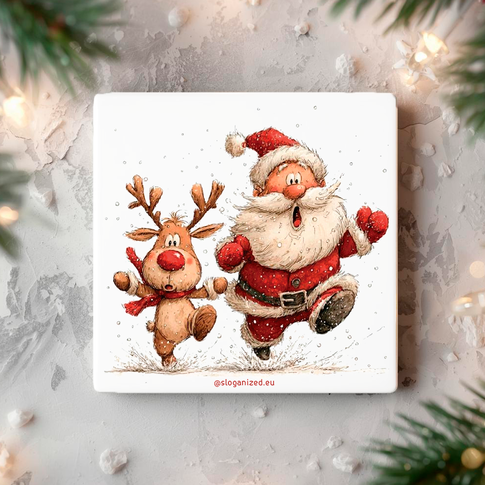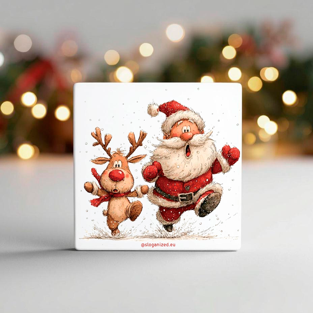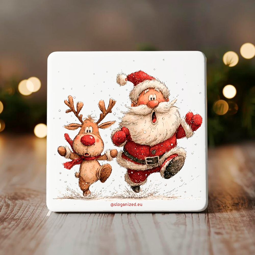 Κεραμικό Σουβέρ με Άγιο Βασίλη και Ρούντολφ να τρέχουν – Γιορτινό σχέδιο, με φελλό (10x10cm)