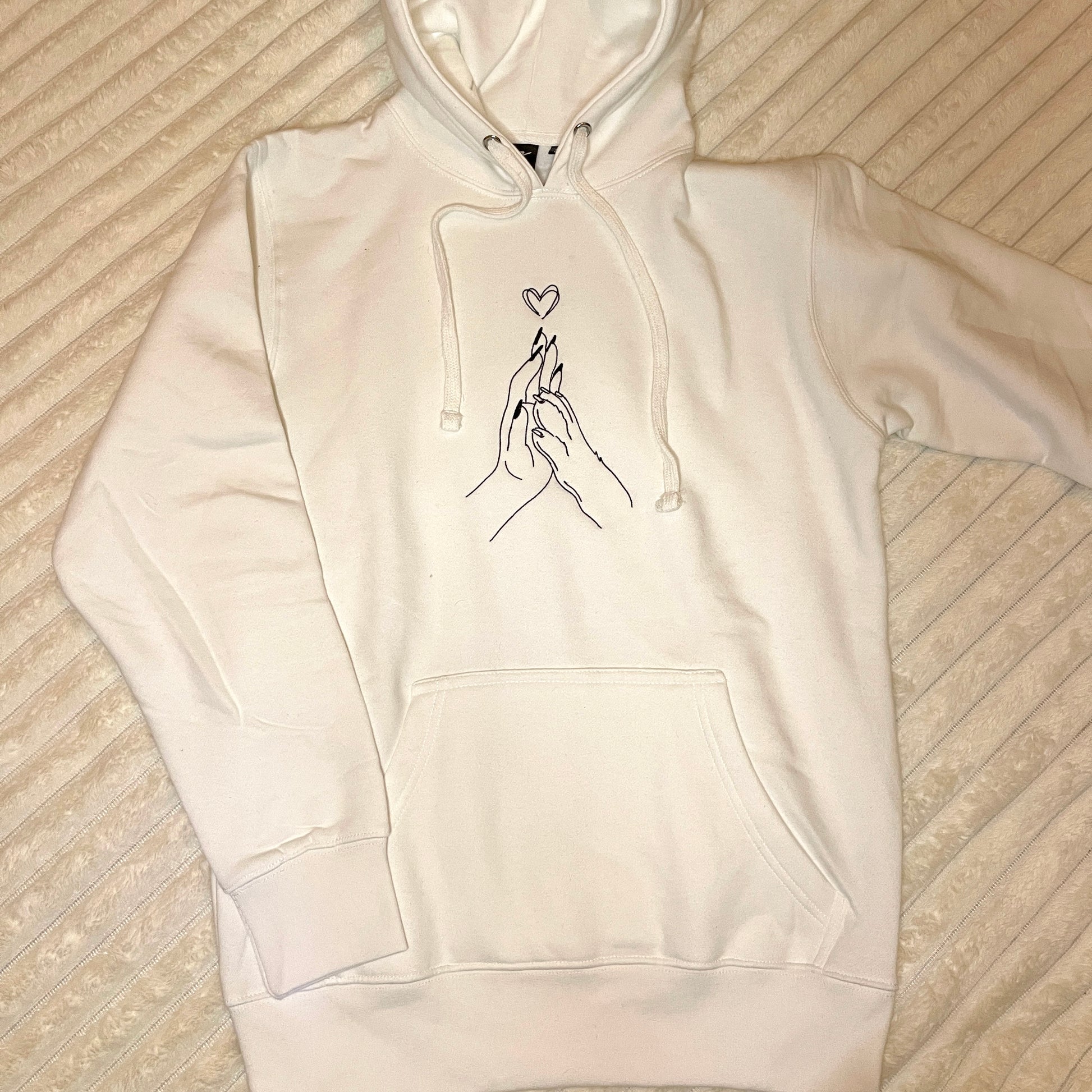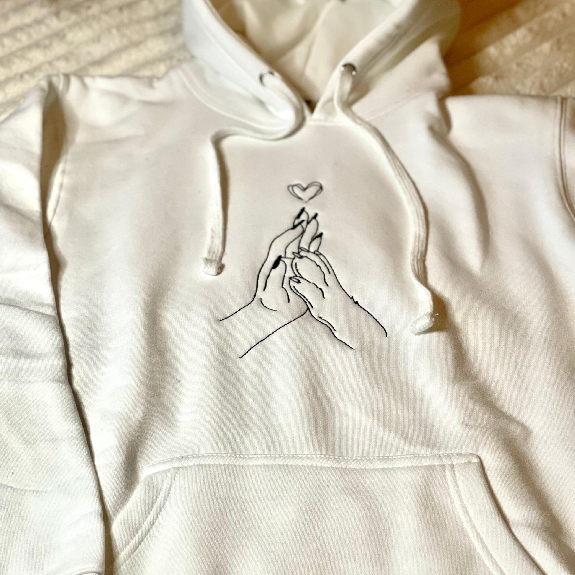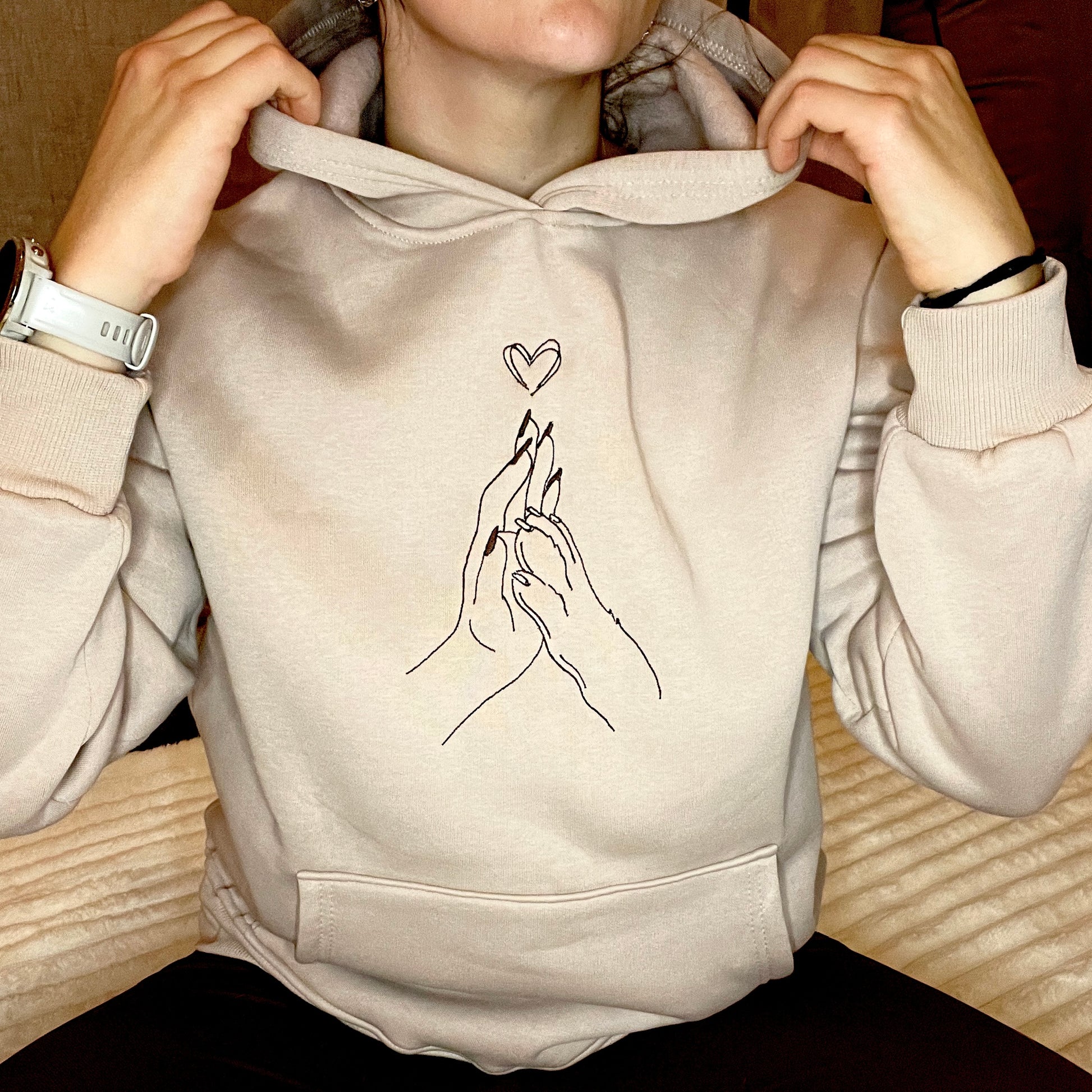 Με minimal γραμμικό σχέδιο και ποιοτικό κέντημα (όχι στάμπα), αποτυπώνει τη στιγμή που δύο χέρια –ανθρώπου και σκύλου– ενώνονται με ένα μικρό καρδούλι από πάνω… γιατί η αγάπη λέει πάντα την αλήθεια.